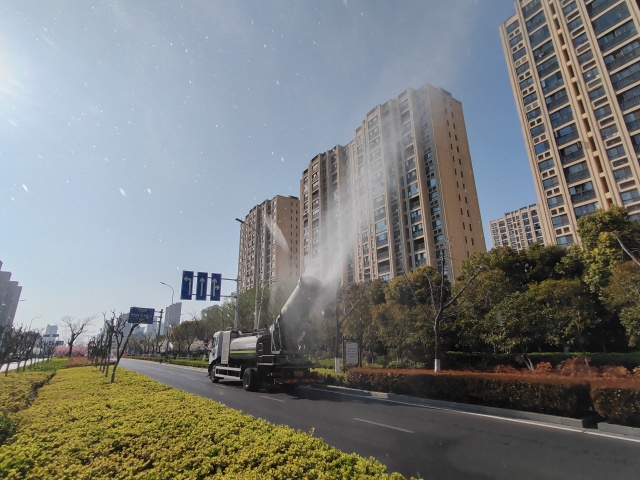 “空中”清洗,“洗”出清新氣。隨著春季氣溫的升高,兩臺(tái)搭載大型“霧炮”的多功能抑塵車(chē)每天“不辭辛勞”地在園區(qū)主次干道上緩緩行駛,噴射出的水霧在陽(yáng)光照射下劃出一道道絢麗的彩虹,不僅裝扮了城市之美,更能有效“捕捉”空氣中PM2.5、PM10等懸浮顆粒,使空氣更加清新。