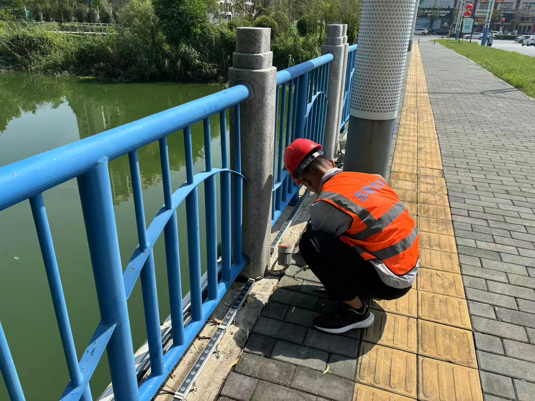 為民河、利民河沿岸、環(huán)形景觀帶及蘇州公園等區(qū)域的景觀燈也是重點(diǎn)排查對(duì)象。華燈初上,維護(hù)人員按照步巡計(jì)劃,沿河逐段細(xì)致檢查。他們對(duì)RGB全彩洗墻燈、景觀柱燈、抱樹燈等的運(yùn)行狀態(tài)進(jìn)行全面檢測:俯身檢查線路外皮是否因高溫開裂,確認(rèn)沿河燈具安裝牢固程度,并對(duì)損壞燈具及時(shí)更換。