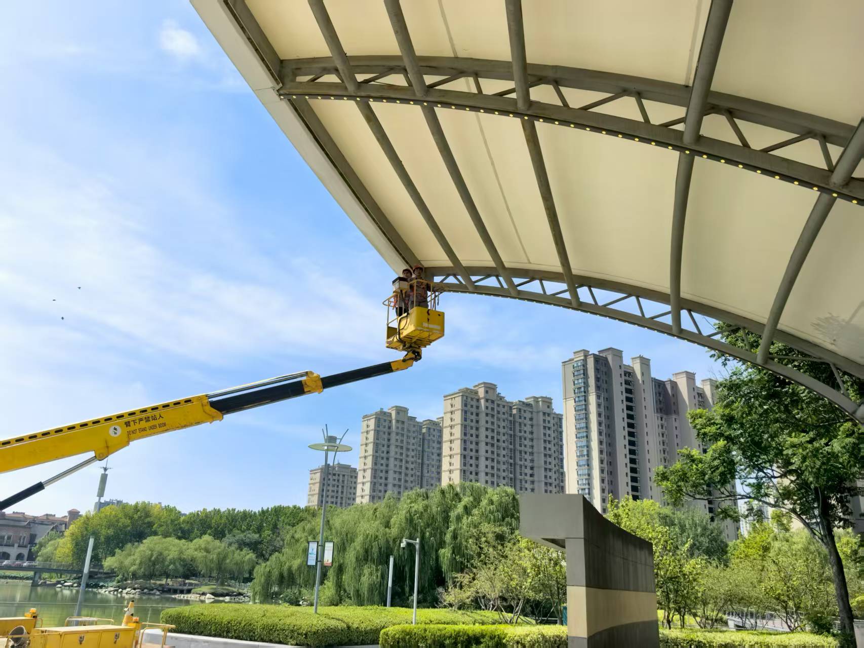 “今天在蘇州公園大舞臺(tái)進(jìn)行登高作業(yè),維修頂部燈光。注意作業(yè)平臺(tái)與頂棚保持安全距離……”8月20日上午9點(diǎn),夏日驕陽似火,蘇州公園作業(yè)現(xiàn)場氣溫已接近37℃。園區(qū)機(jī)電維護(hù)項(xiàng)目部技術(shù)負(fù)責(zé)人沈剛強(qiáng)和同事們開始了當(dāng)天的第一場高空維修。