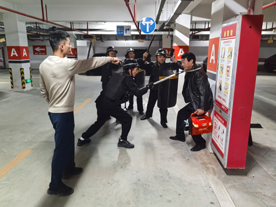 與此同時,應(yīng)急處置崗隊員也攜帶防暴盾牌、橡膠棍等專業(yè)器械火速集結(jié),以最快速度抵達地下車庫指定區(qū)域。面對負隅頑抗的 “盜竊分子”,隊員們沉著冷靜,憑借日常訓練形成的默契配合,迅速結(jié)成戰(zhàn)術(shù)小組,從不同方向?qū)?“盜竊分子” 實施包圍,果斷出擊、動作規(guī)范,僅用數(shù)分鐘便成功將其治服,并移送公安機關(guān)處理。