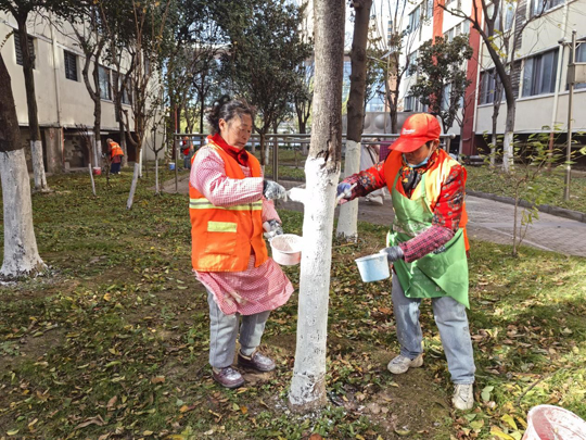 細(xì)心的業(yè)主不難發(fā)現(xiàn),樹木已悄然穿上整齊的“冬裝”。物業(yè)工作人員有條不紊地對(duì)喬木根部進(jìn)行涂白處理。這層白色“防護(hù)衣”不僅美觀,更是樹木越冬的“守護(hù)者”——它能有效反射部分陽光,減緩樹干因晝夜溫差過大而導(dǎo)致的凍裂風(fēng)險(xiǎn),同時(shí)清除樹皮縫隙中潛藏的害蟲及蟲卵,為來年春季樹木茁壯成長打下堅(jiān)實(shí)基礎(chǔ)。
