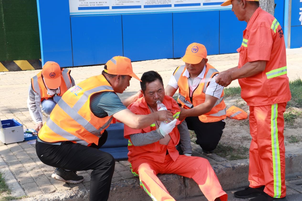 此次演練模擬一名環(huán)衛(wèi)工人在作業(yè)過程中,突然感到頭暈、心慌乏力,立即向主管人員電話求助。主管人員隨即趕到現(xiàn)場(chǎng)查看情況,發(fā)現(xiàn)環(huán)衛(wèi)工人躺坐在現(xiàn)場(chǎng),面色潮紅、大汗淋漓,精神狀況不佳,系中暑跡象,立即向項(xiàng)目經(jīng)理報(bào)告,聯(lián)系應(yīng)急救援人員,并呼喊附近作業(yè)人員將其攙扶到陰涼處,解開衣扣散熱,應(yīng)急救援人員趕到現(xiàn)場(chǎng)后,立即用濕毛巾、酒精棉擦拭身體,涂上清涼油,喂服藿香正氣水、淡鹽水......,經(jīng)過初步救護(hù),中暑人員癥狀得以緩解后,隨即將其送往園區(qū)社區(qū)衛(wèi)生服務(wù)中心進(jìn)一步治療。